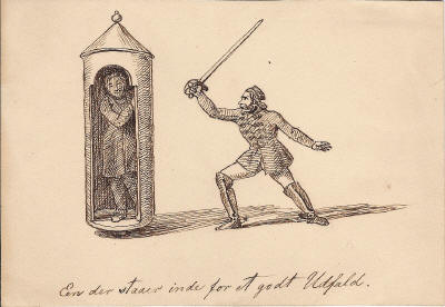 I vinduesfordybningen til venstre for og bag Krieger ses A.S. Ørsted i samtale med biskop J.P. Mynster, forsamlingens aldersformand.