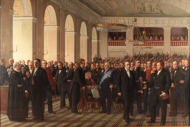 Til højre helt i forgrunden står D.G. Monrad, forfatteren af grundlovsudkastet, over for Orla Lehmann.